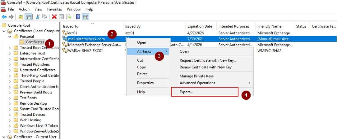 Sertifikayı dışarı aktaracağımız sunucuda (Bu yazıda Exchange server) MMC’yi (Microsoft Yönetim Konsolu) başlatın ve sertifika ek bileşenini ekleyin. Let’s Encrypt sertifikasına sağ tıklayın ve Tüm Görevler’e tıklayın . Dışa Aktar … ‘ı tıklayın .